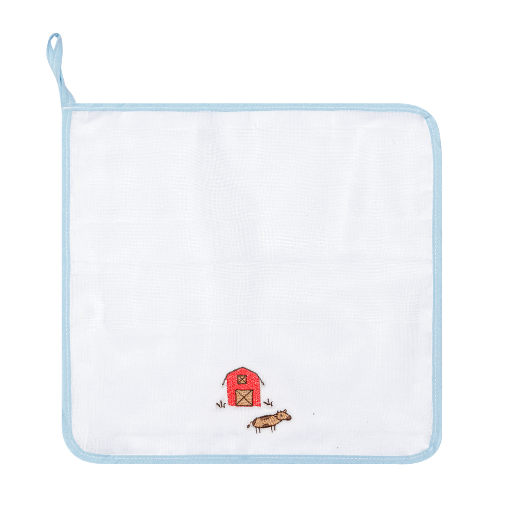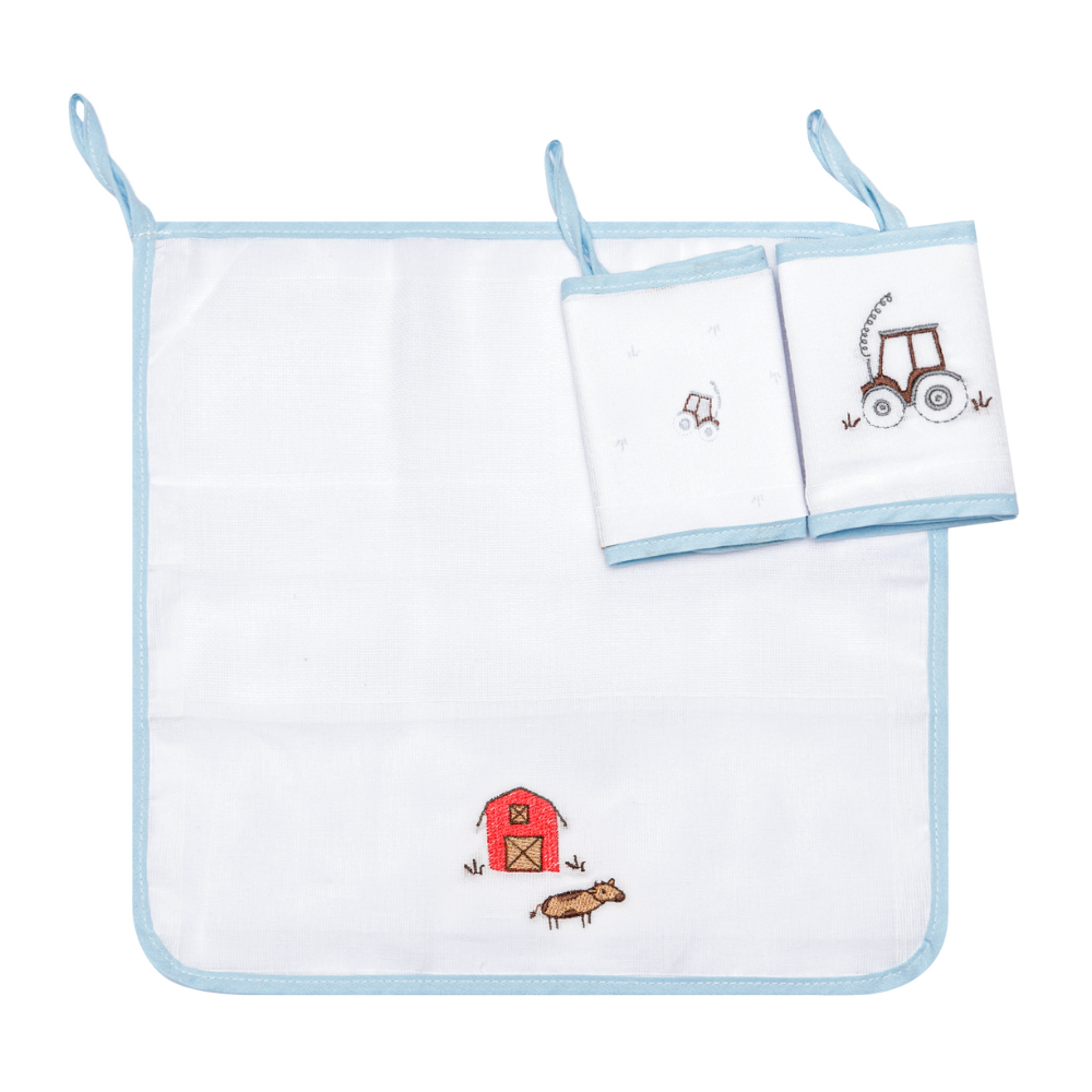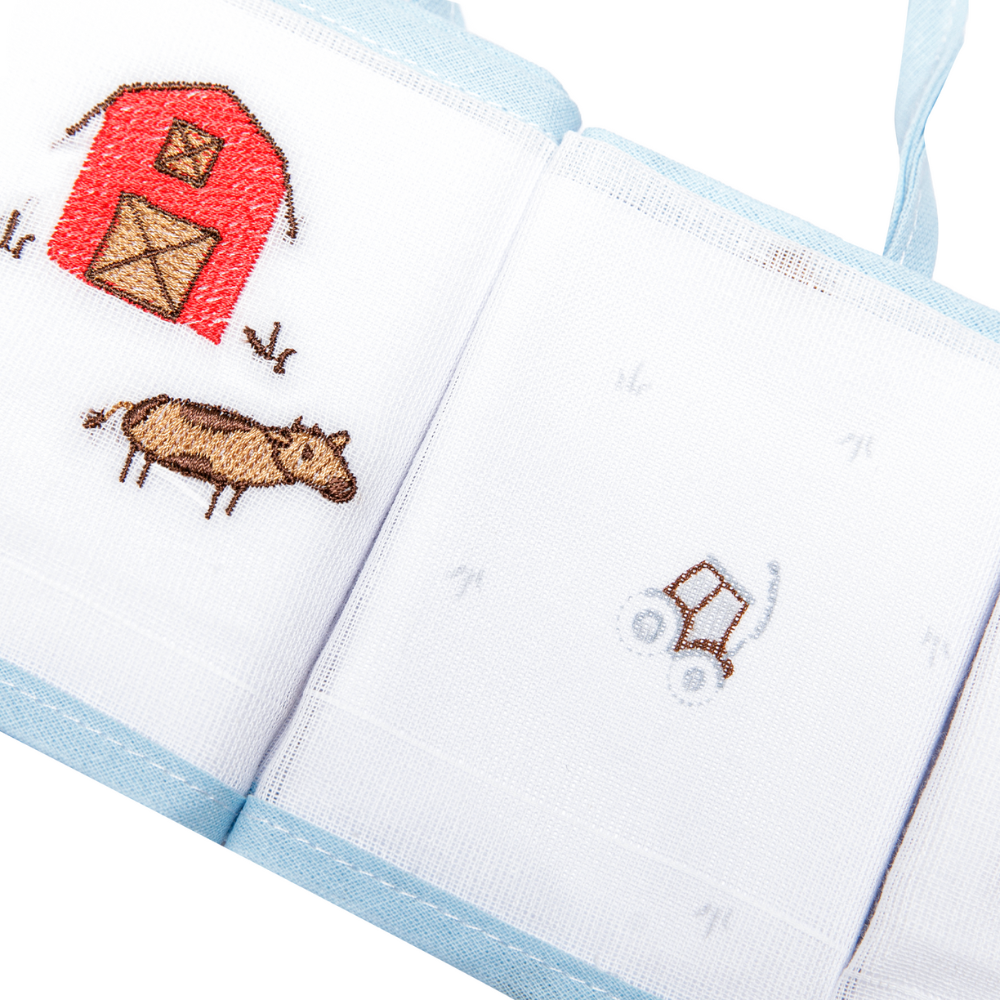 Cada babete apresenta uma estampa lúdica e alegre de animais da fazenda (como vaquinhas, porquinhos e pintinhos) em tons de azul e cores coordenadas, adicionando um toque de diversão e vida campestre. Este kit une funcionalidade, praticidade e um visual charmoso, tornando o momento da refeição mais divertido e a limpeza mais fácil para os pais.