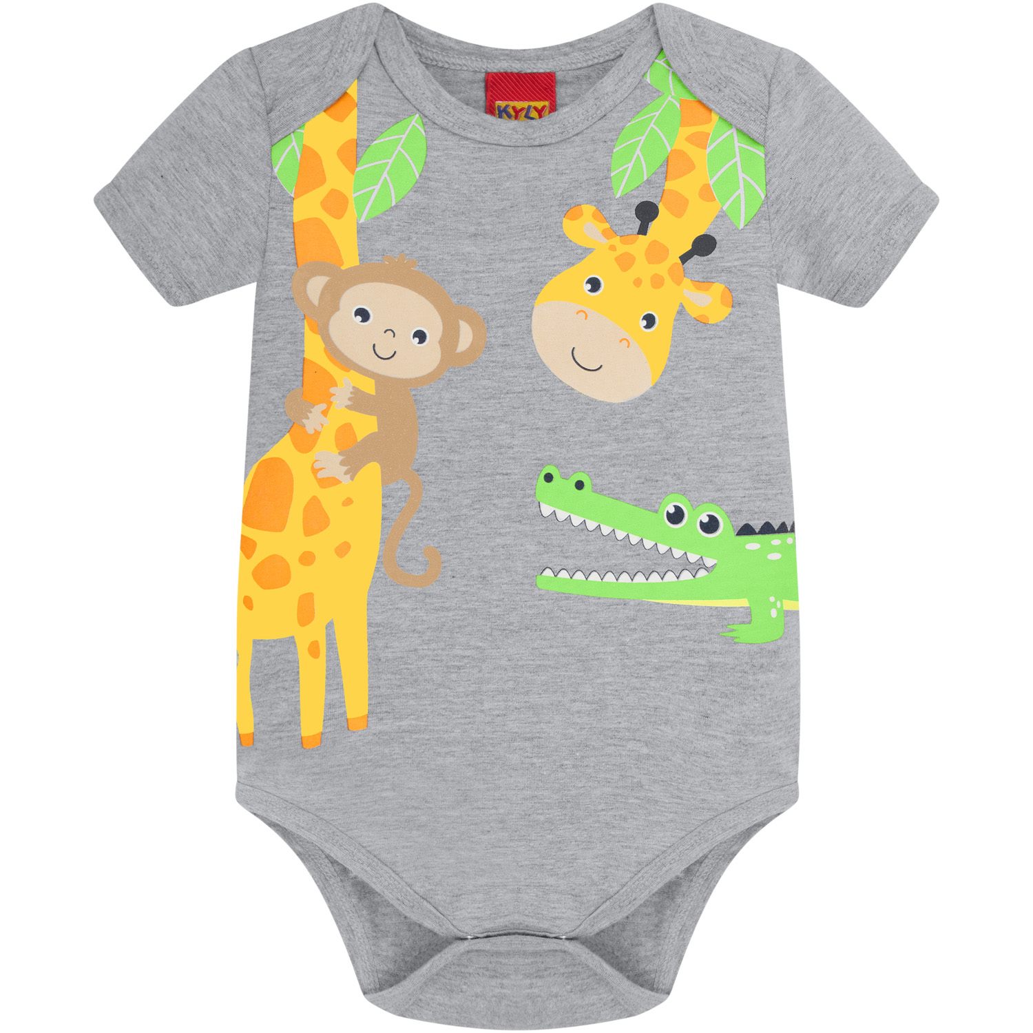 O Body Bebê Masculino Kyly possui estampa frontal de animais, ombros transpassados e abertura entrepernas por botões de pressão.