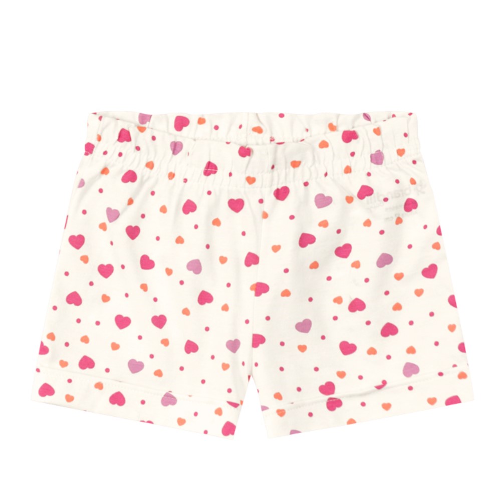 Já a bermuda é confeccionada em cotton sem pelúcia, que é ideal para os dias de primavera, conta com a estampa de coraçoes e cós em elástico.