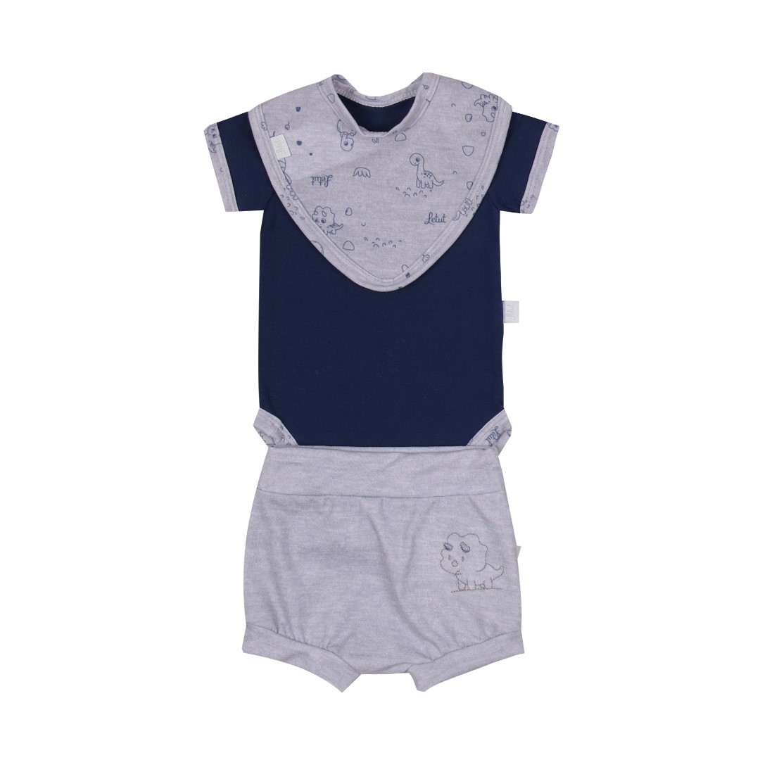 Conjunto Bady Curto de Body em Malha Conforto com Abertura Botão de Pressão no Fundo, Bandana em Malha Polifiado Estampa Dino e Shorts em Malha Polifiado Mescla com Cós de Elástico e Detalhe Bordado – 3 Peças.