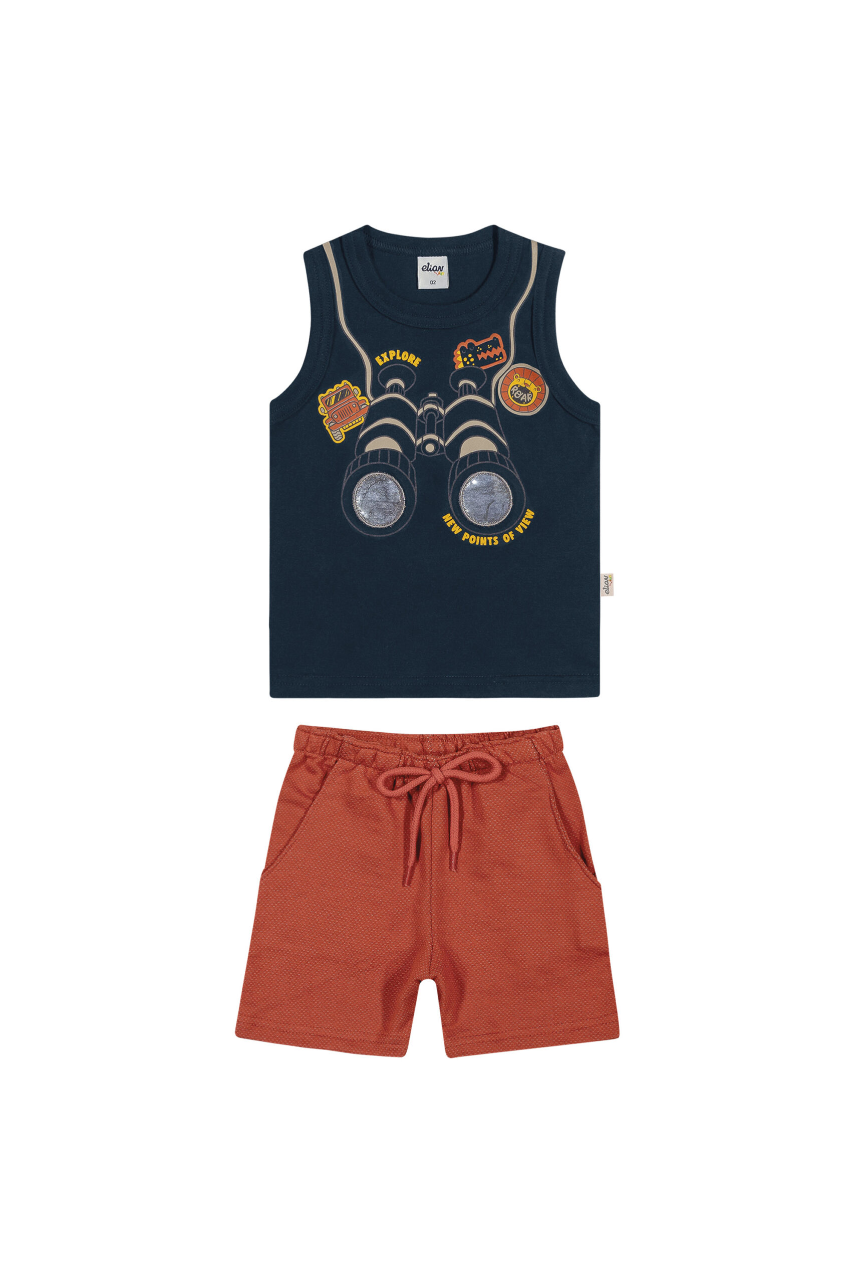 O Conjunto Menino Infantil Aventureiro Elian conta com uma camiseta com mangas regatas, gola redonda e uma estampa de binóculos com bordado com aplique plástico e estampa neon, também conta com uma bermuda básica.