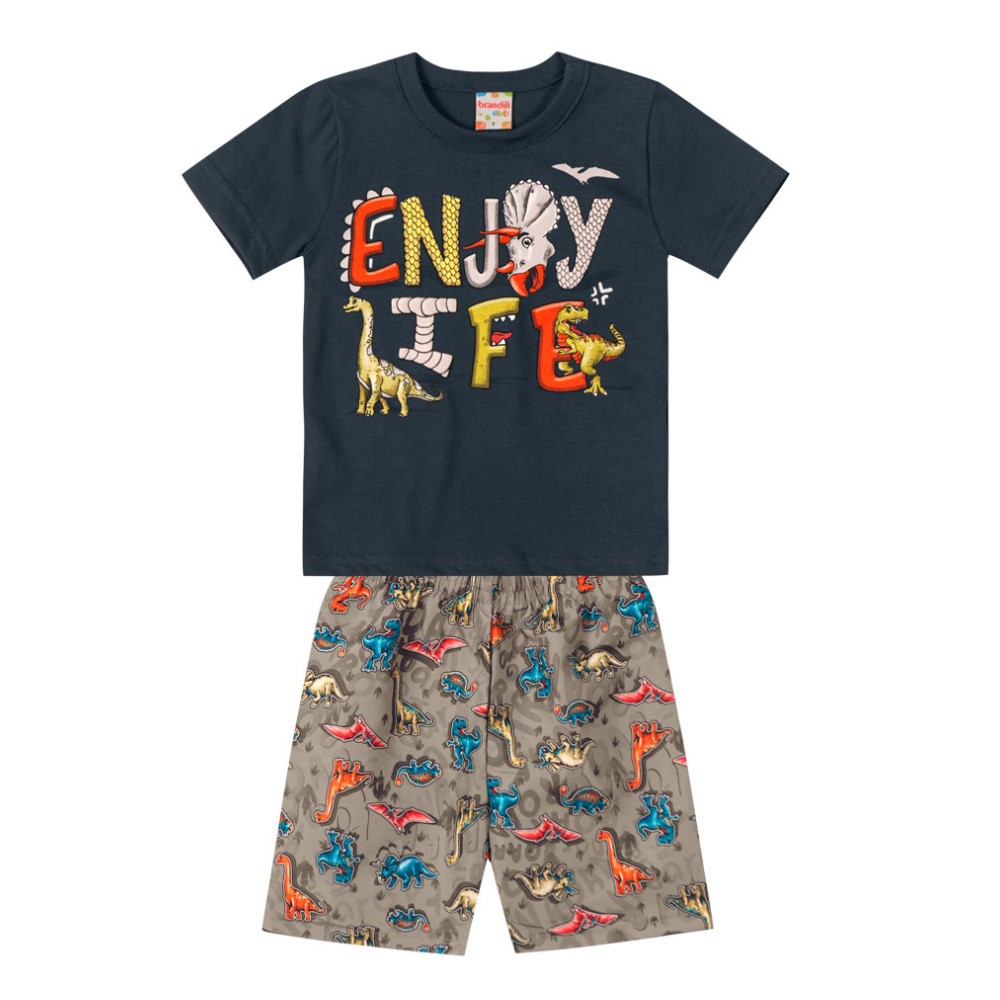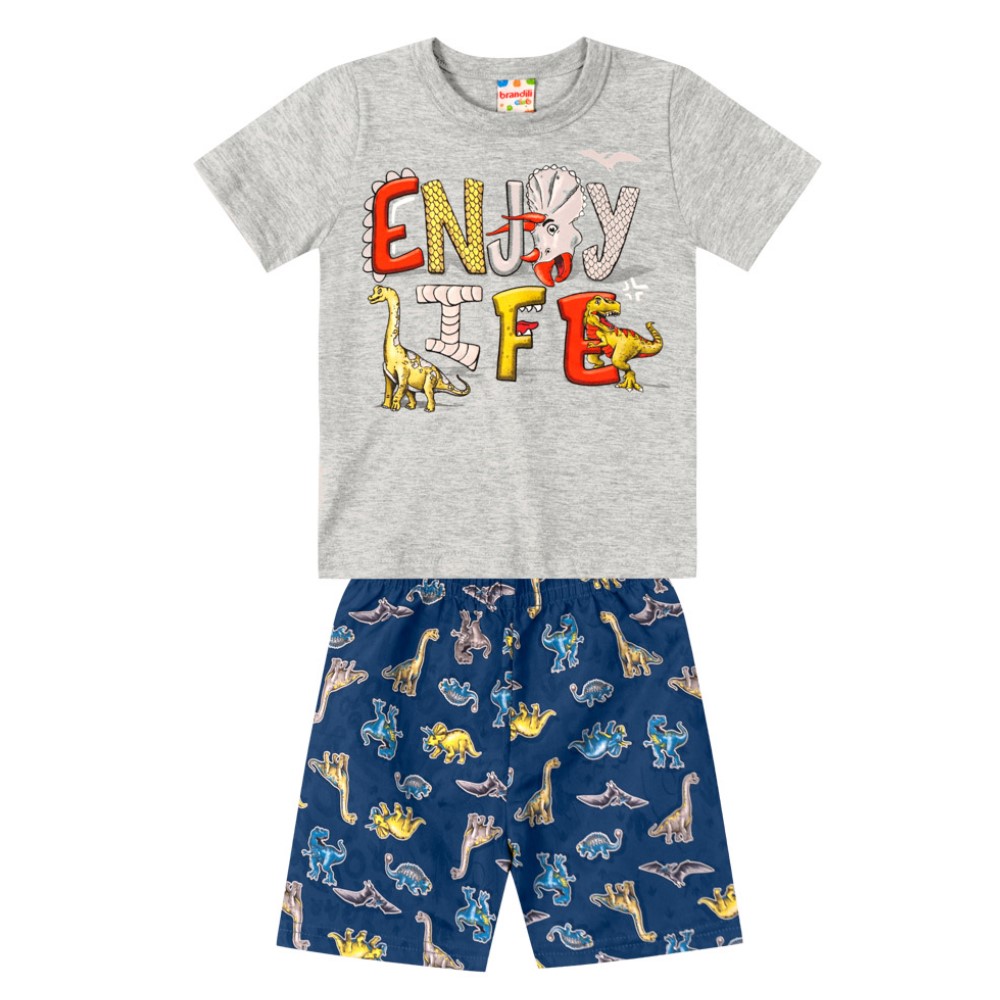 Já a bermuda é confeccionada em moletinho sem pelúcia, que é ideal para os dias de primavera, conta com a estampa de dino e cós em elástico.
