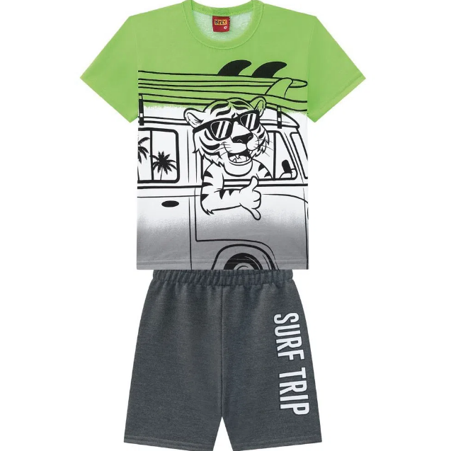 A Camiseta Infantil Masculina Kyly possui modelagem tradicional, estampa neon frontal e acabamento no decote com debrum. A Bermuda Infantil Masculina Kyly possui estampa com escrita na lateral e elástico confortável no cós.