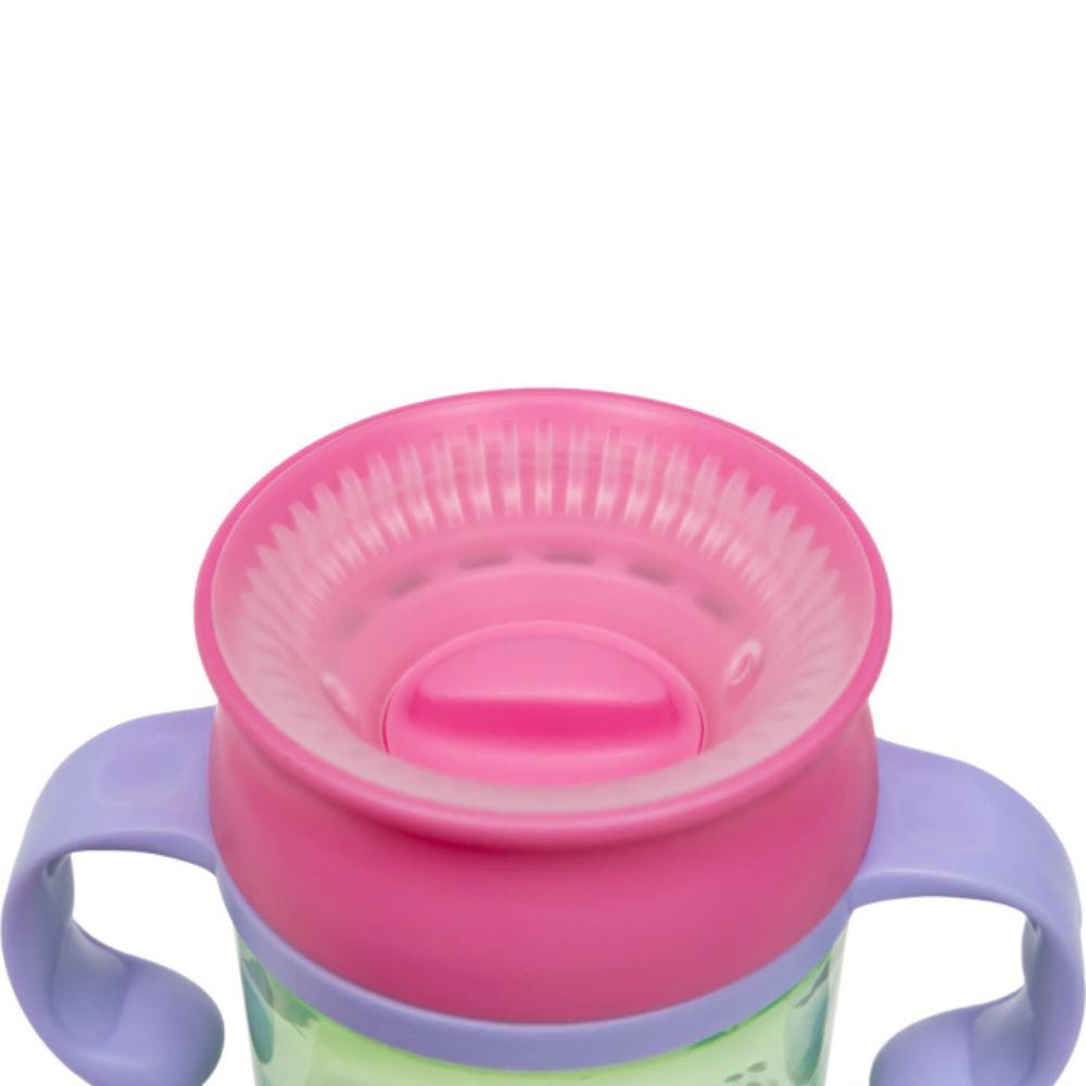 Tecnologia 360º: Permite que a criança beba por toda a borda, de qualquer lado do copo. Isso ajuda no desenvolvimento da musculatura oral e prepara a bebê para o uso do copo convencional.
