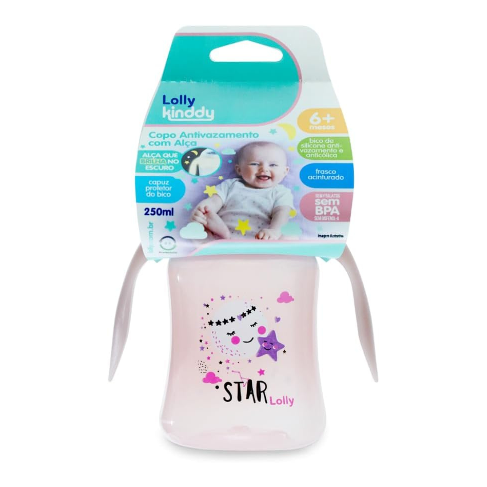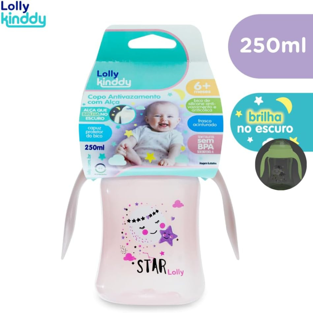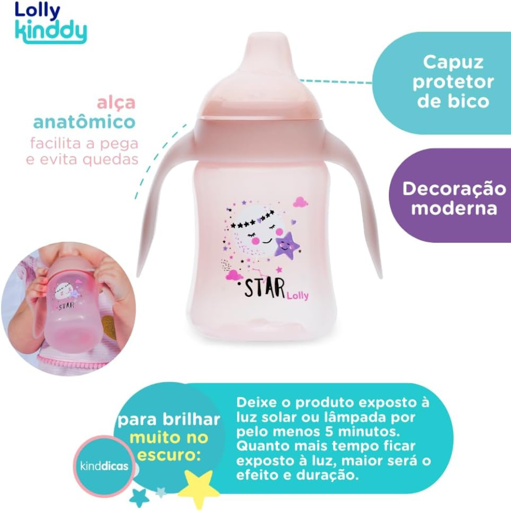 Copo de Treinamento Lolly Kinddy de 250ml na cor rosa, perfeito para bebês a partir de 6 meses. O detalhe que encanta: a alça brilha no escuro, trazendo autonomia e diversão! Possui bico em silicone macio, sistema antivazamento e anticólica. Totalmente BPA Free. Um passo seguro e charmoso rumo à independência!