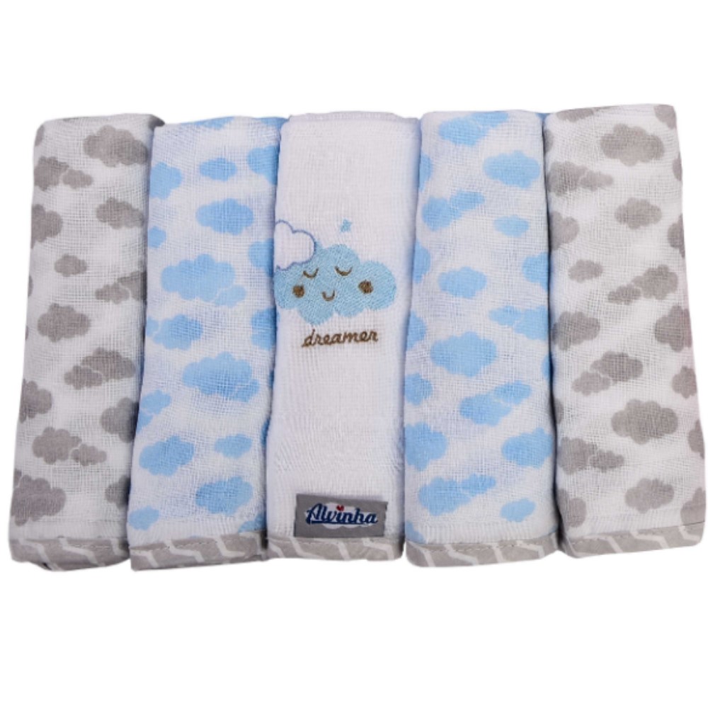 A linha Alvinha trabalha o tema nuvem de uma forma lúdica e delicada. Ela possui peças nas cores rosa, azul e cinza, permitindo, assim, uma ampla gama de escolhas para você. Com ela, o quartinho do seu pequeno se transforma num verdadeiro pedacinho do céu! Venha se encantar com a leveza e sutileza desta coleção! As fraldas são confeccionadas com tecido 100% algodão, portanto, garante a máxima absorção! Assim, o bebê fica mais sequinho por mais tempo. Outra funcionalidade que elas podem ter é a de cobrir ou proteger o bebê durante a amamentação.