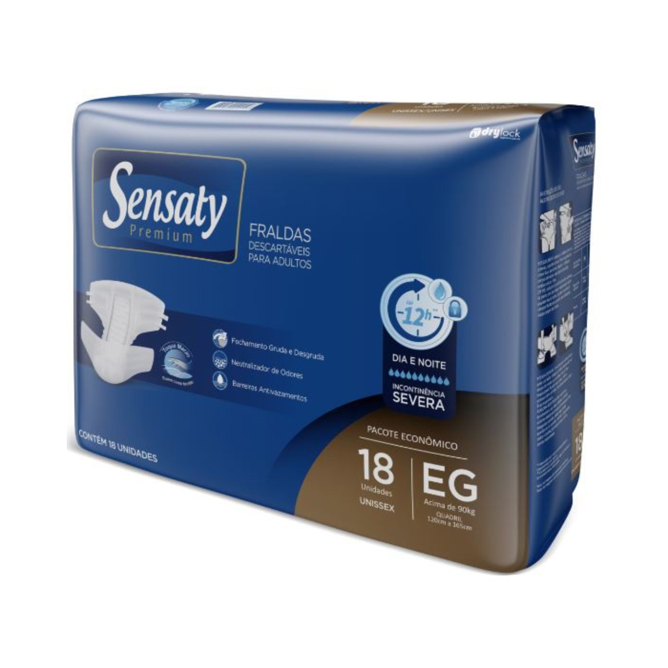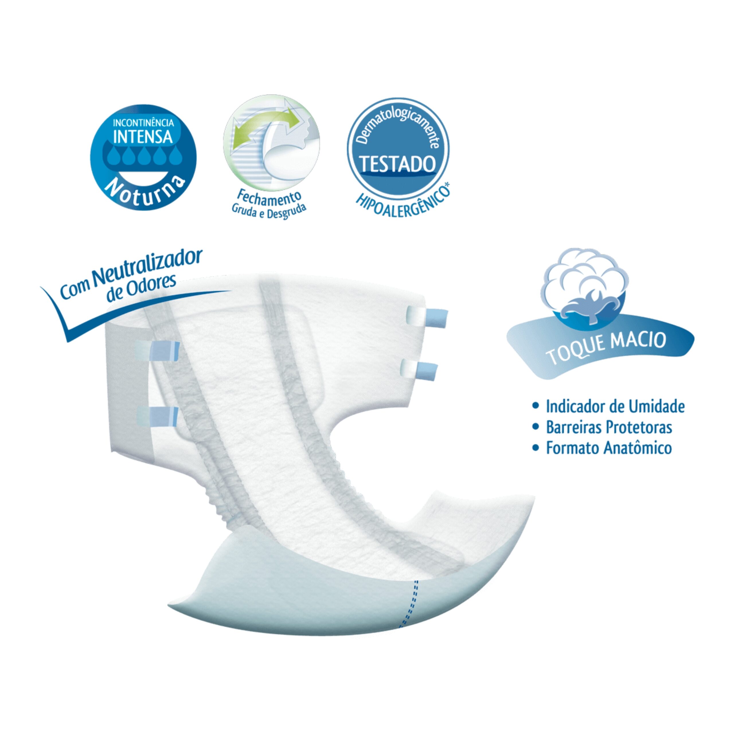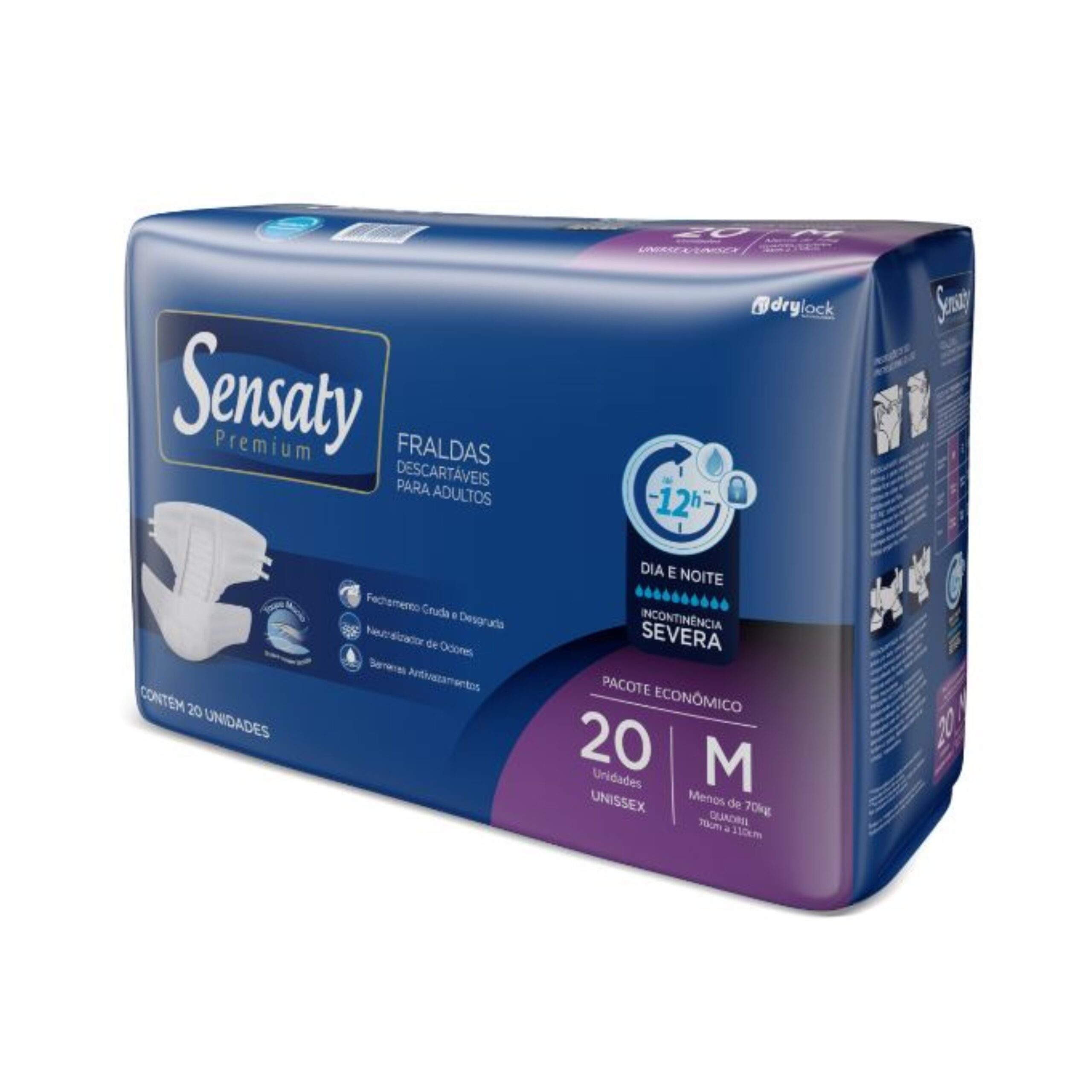 A fralda descartável Sensaty Premium é unissex, indicada para pessoas com incontinência urinária severa, que precisam de cuidados essenciais e de um produto de qualidade. Como todos os produtos Sensaty Premium, a fralda descartável é desenvolvida com a mais alta tecnologia, possibilitando excelente absorção, neutralizador de odores, formato anatômico, barreiras antivazamento, fechamento gruda e desgruda, podendo ajustar perfeitamente ao corpo do usuário. A fralda é um produto testado dermatologicamente e hipoalergênico.