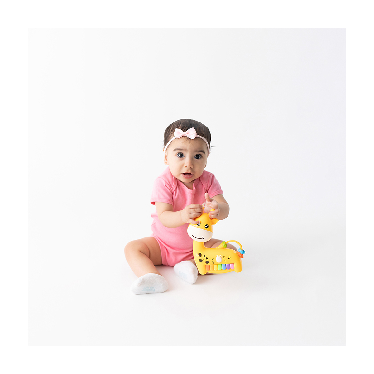 Desenvolvida com materiais seguros e resistentes, a Girafa Musical é fácil de segurar, incentivando a coordenação motora fina e a percepção tátil. Ao acionar suas funções sonoras, a criança é apresentada a melodias suaves que estimulam a percepção auditiva e a curiosidade, enquanto as luzes e texturas mantêm a atenção focada na descoberta. É um item indispensável para a fase em que o bebê começa a interagir mais ativamente com o mundo ao seu redor, transformando o aprendizado em um momento de pura diversão.
