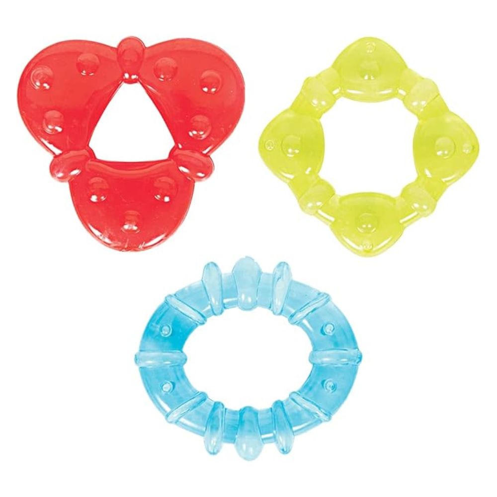 Esses mordedores com água e formatos geométricos oferecem diferentes texturas para massagear a gengiva, o que pode ser benéfico para ajudar a acalmar o bebê durante o desconforto causado pelo nascimento dos primeiros dentes.