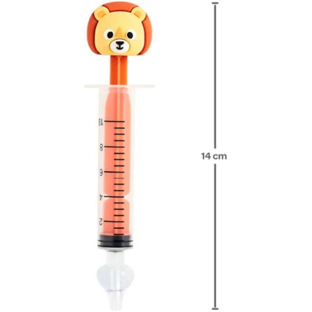 Design Lúdico: O formato de seringa com o tema de leão é divertido e amigável, ajudando a diminuir a resistência da criança na hora da lavagem nasal.