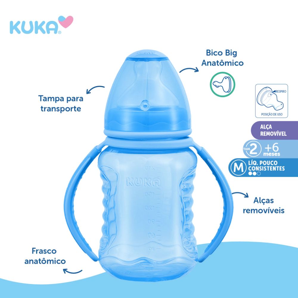 A Mamadeira Kuka Aquarela Big foi desenvolvida para oferecer conforto e praticidade durante a alimentação do bebê. Com bico ortodôntico tamanho 2, proporciona sucção anatômica, auxiliando no posicionamento correto da língua e contribuindo para uma mamada mais confortável.
