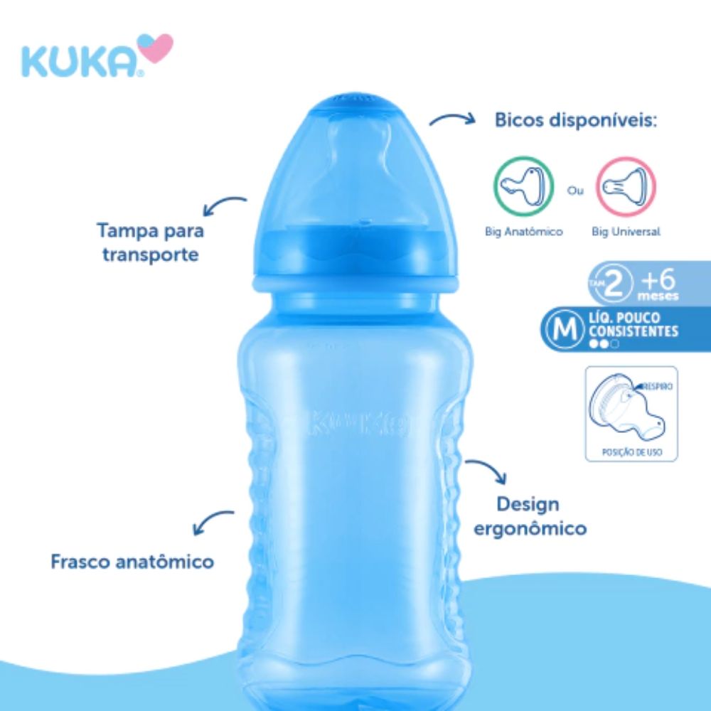 A Mamadeira Kuka Aquarela Big foi desenvolvida para oferecer conforto e praticidade durante a alimentação do bebê. Com bico ortodôntico tamanho 2, proporciona sucção anatômica, auxiliando no posicionamento correto da língua e tornando a mamada mais confortável.