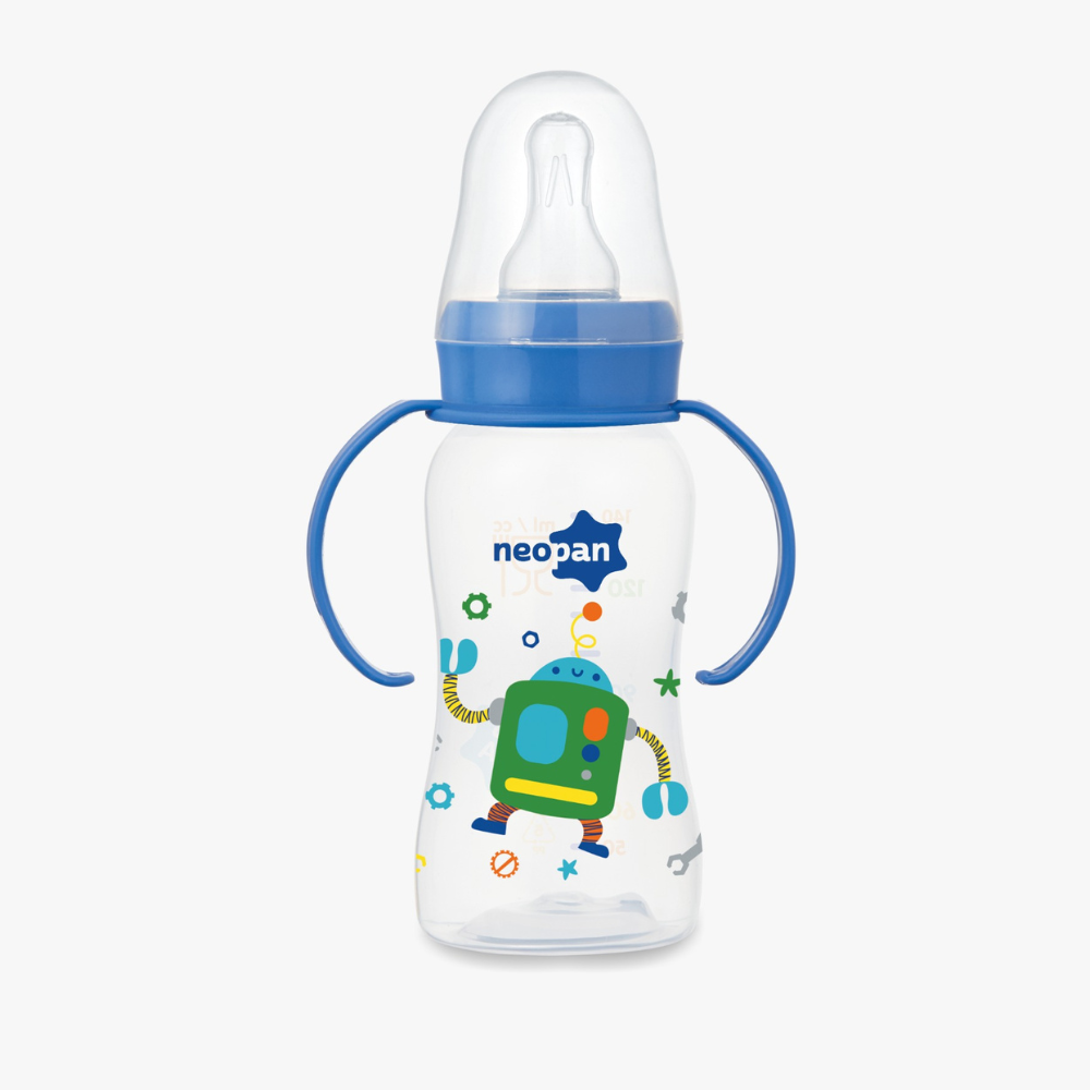 Este modelo específico na cor azul com tema Robô possui alças para facilitar que o bebê comece a segurar a mamadeira de forma independente.