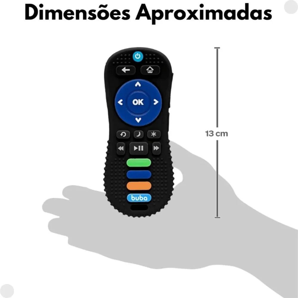 Mordedor da Buba em formato divertido de Controle Remoto, indicado para bebês a partir de 4 meses (+4m). Ajuda a aliviar o desconforto do nascimento dos primeiros dentes, com superfícies de texturas variadas para massagear a gengiva. É feito de material macio, atóxico e Livre de BPA, em cor Neutro (cinza/branco/colorido discreto).