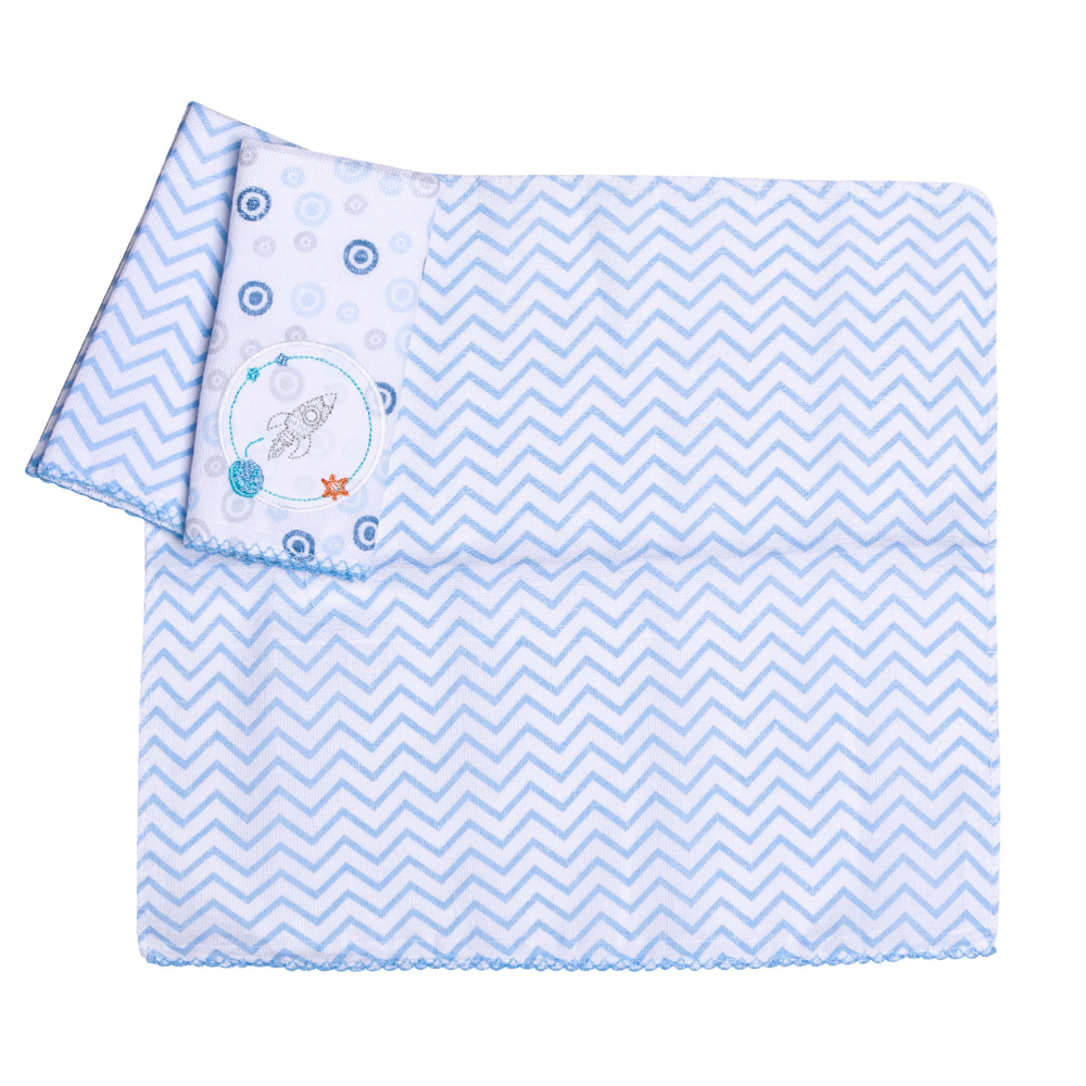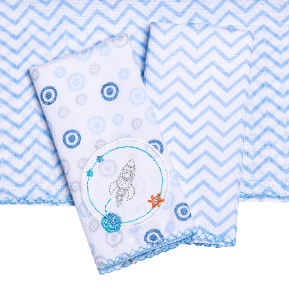 Cada pano vem com um delicado bordado de planetas e elementos espaciais, como foguetes e estrelas, em tons de azul e outras cores suaves, adicionando um toque lúdico e intergaláctico. Este kit combina funcionalidade, qualidade e um visual encantador, sendo indispensável no enxoval do seu príncipe.