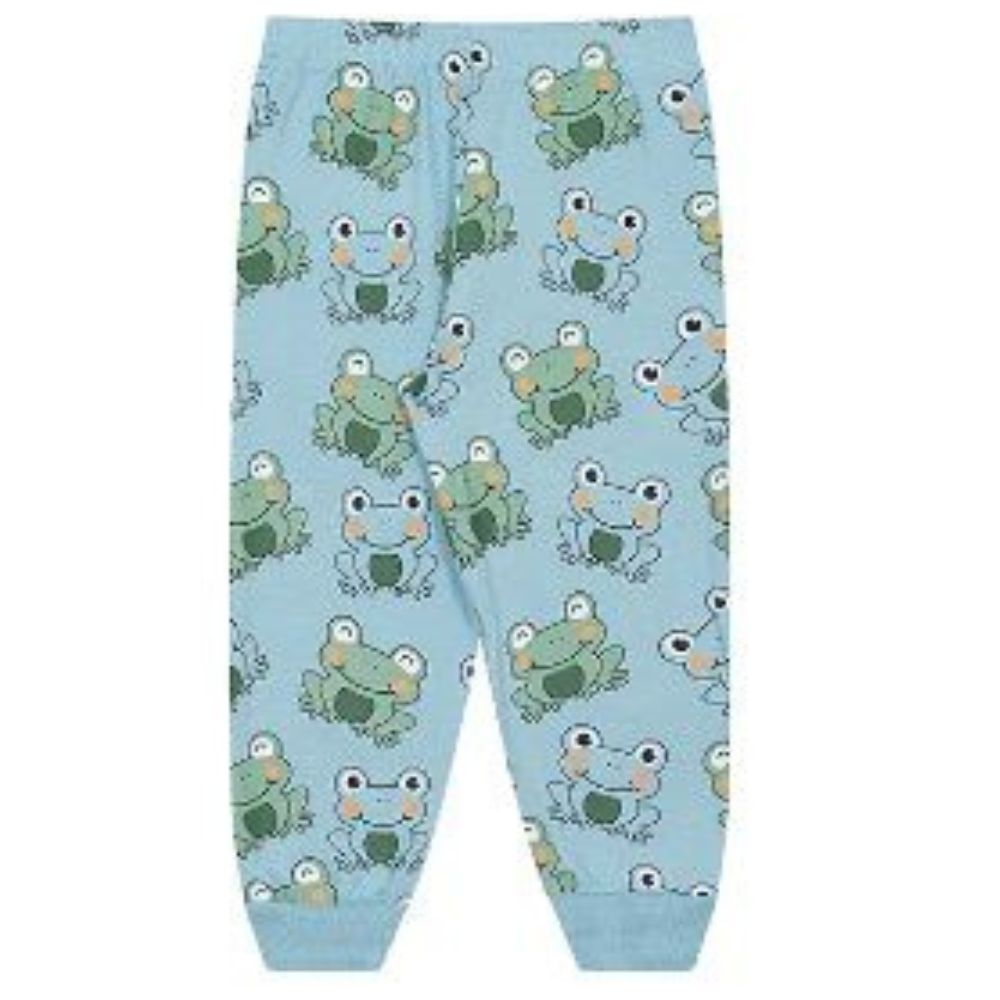 A calça de meia malha completa o conjunto, com elástico no cós e punho de ribana para um ajuste seguro e confortável. Toda estampada com desenhos de sapo, a calça adiciona um toque de diversão ao visual do pijama.