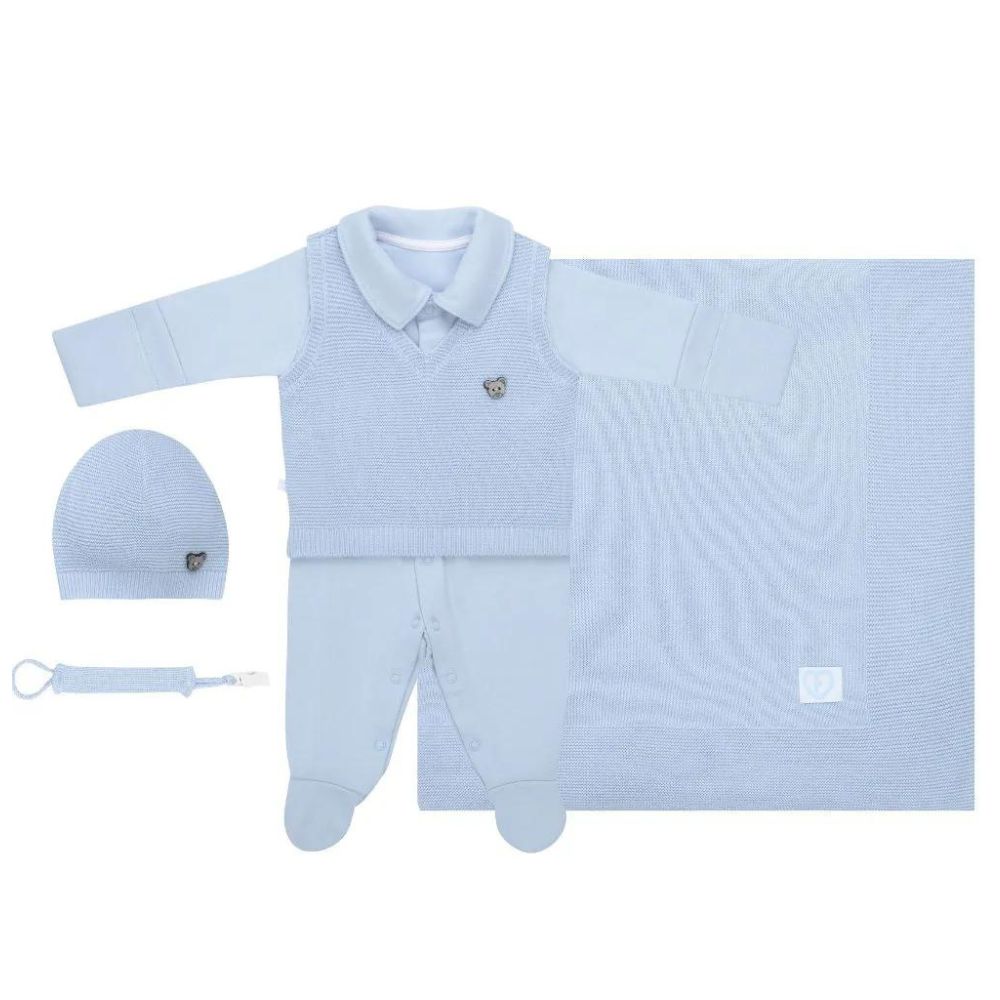 O Kit de saída maternidade é ideal para dar as boas-vindas ao seu bebê com estilo e conforto. O macacão, com todo o acabamento em tricô, proporciona uma sensação de maciez e delicadeza ao toque, enquanto o colete, com detalhes em listras, acrescenta um charme especial ao conjunto. A manta, toda trabalhada em tricô, oferece aconchego e calor para o bebê nos primeiros momentos. Além disso, inclui uma touca e um prendedor de chupeta para completar o enxoval do bebê. Feito com um tecido super macio, leve e confortável, este conjunto é perfeito para manter seu bebê aquecido e confortável desde o primeiro dia.