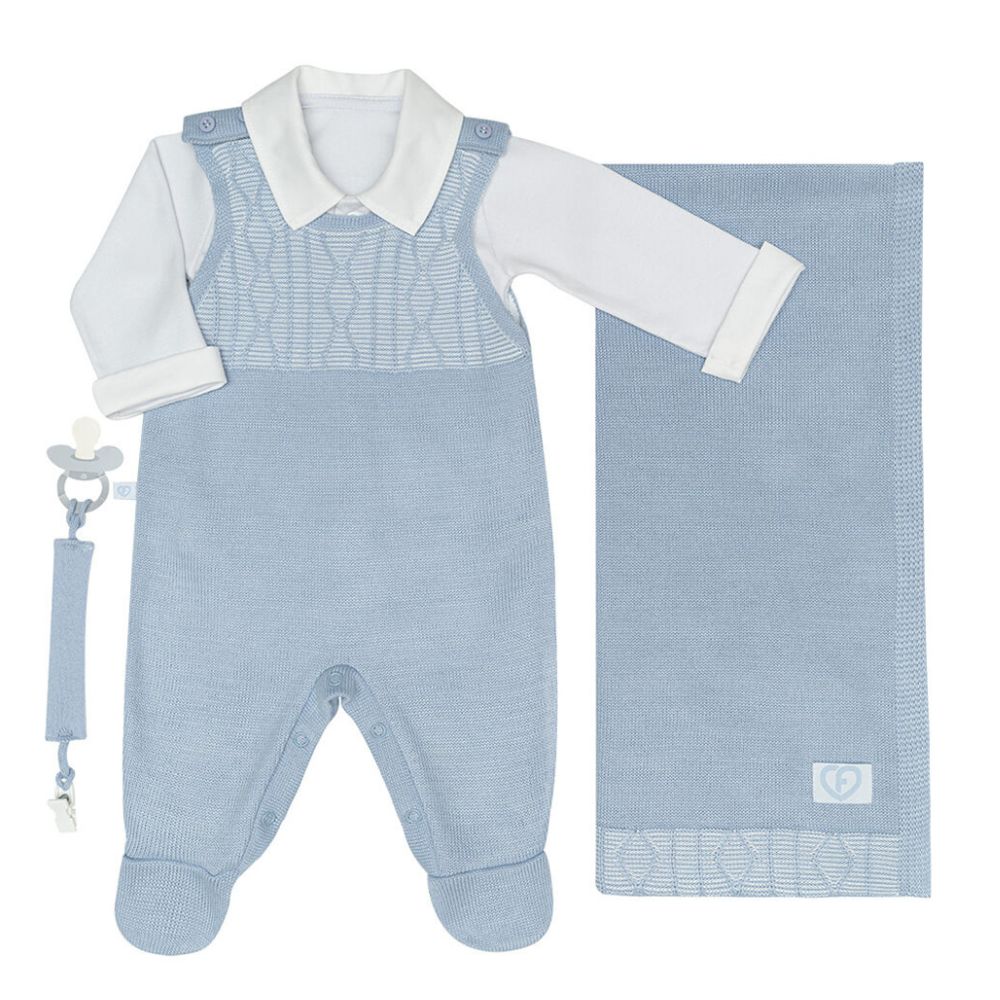 Apresentamos o adorável Kit Saída Maternidade, disponível em três cores: azul claro, verde e marinho. Cada kit contém uma manta, uma jardineira, um body e um porta chupeta.