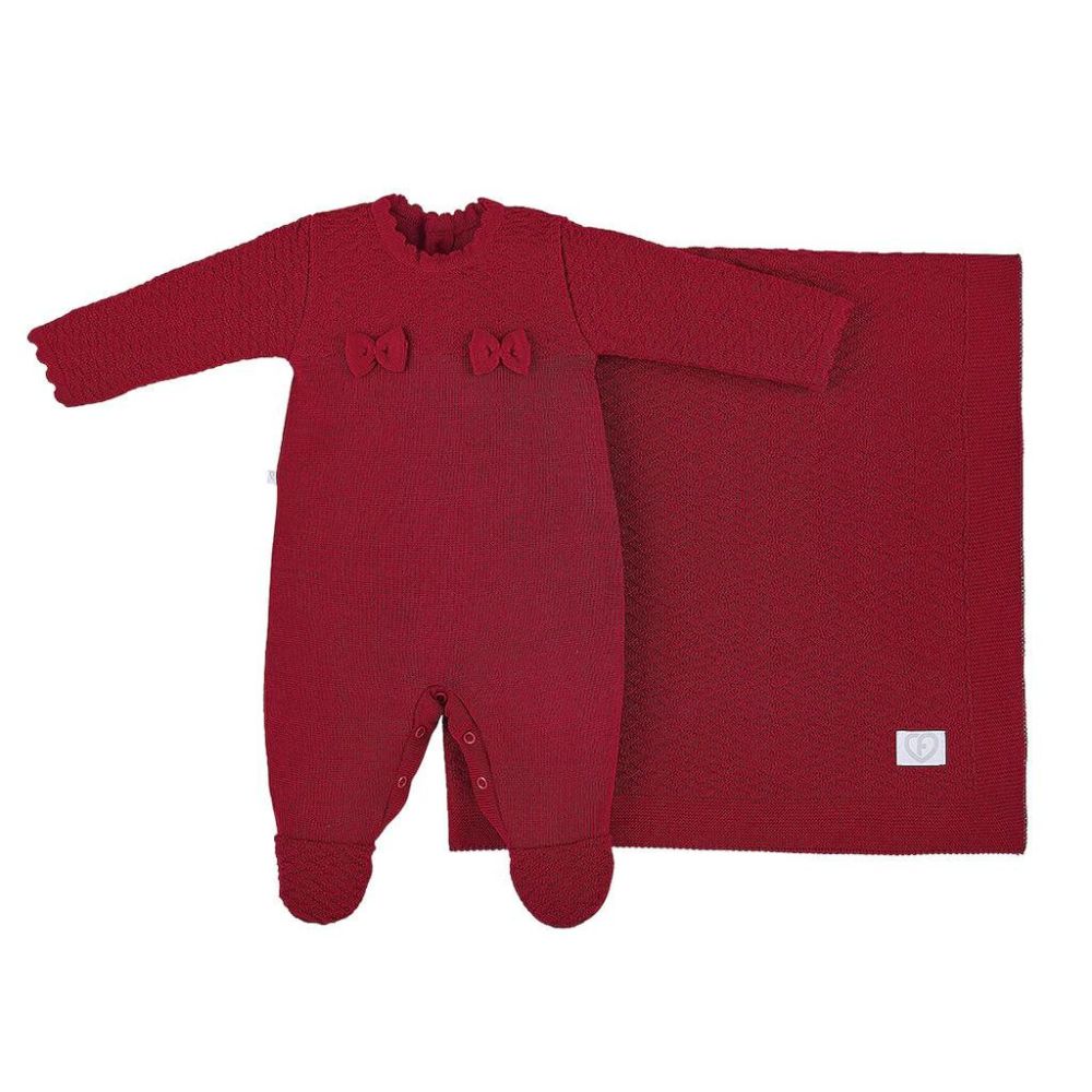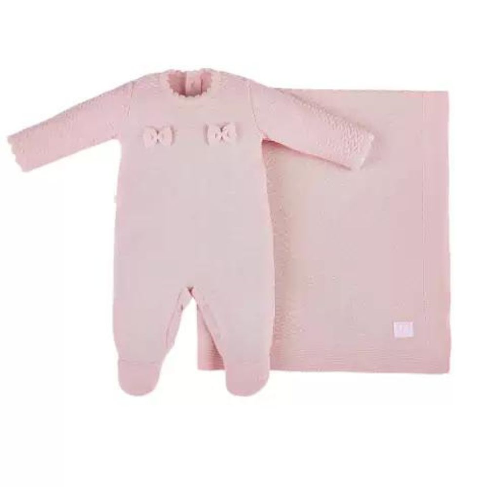 Este conjunto de saída maternidade para meninas inclui um macacão de manga longa com uma delicada gola, adornada com dois lacinhos de tricot na mesma cor, oferecendo um visual charmoso. Com fechamento por botões de pressão na parte de trás, o macacão facilita o vestir do bebê.